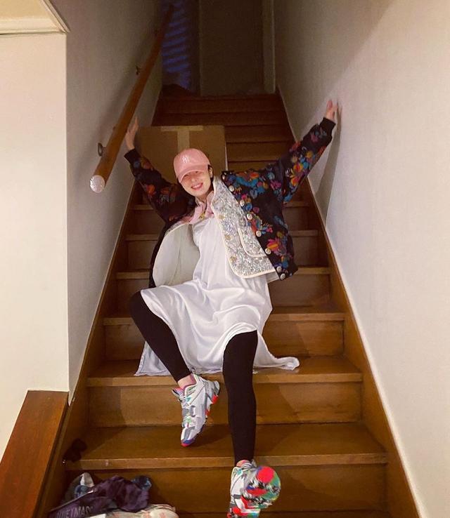 同样的一套造型,泫雅还坐在楼梯上拍了照片,像个小孩子一样手舞足蹈的,笑得眼睛都眯成了一条缝,神采飞扬。