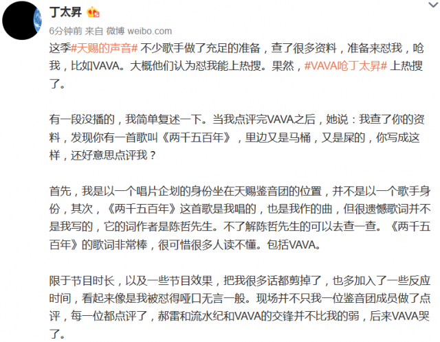 也是《天赐的声音》,在rapper VAVA和双胞胎女团BY2的合作舞台上,丁太升提出:VAVA的歌词太空洞,不够有诗意,音色律动太低级